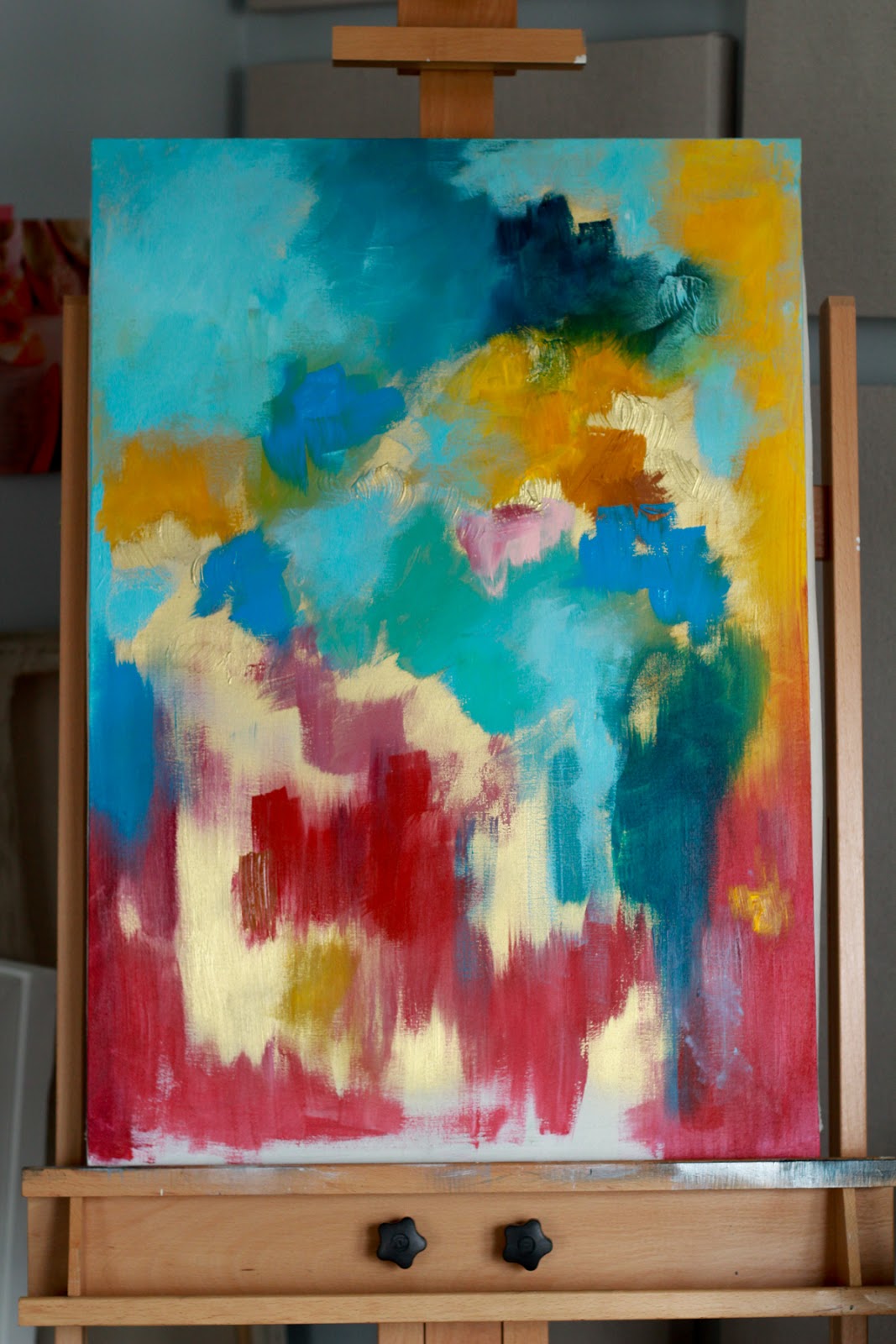 This has a lot of layers. After the initial gold, I painted the colors, then white to push back the boundaries of the color patches, and then gold again, and then more colors, and then more creamy white, and then one more layer of colors. I did a lot of dry brushing to blur things and impressionistic dabs here and there to sprinkle color throughout. You can also see that I decided to go horizontal instead of vertical.